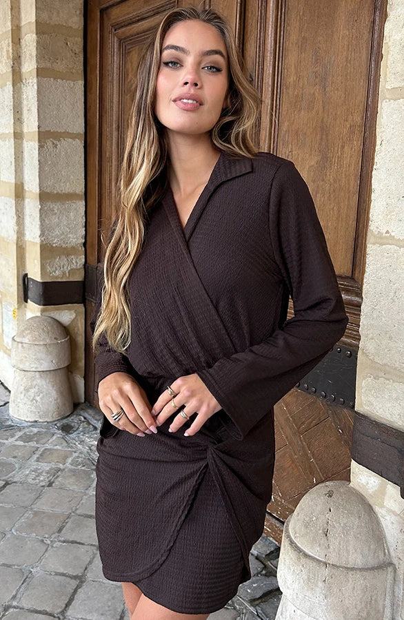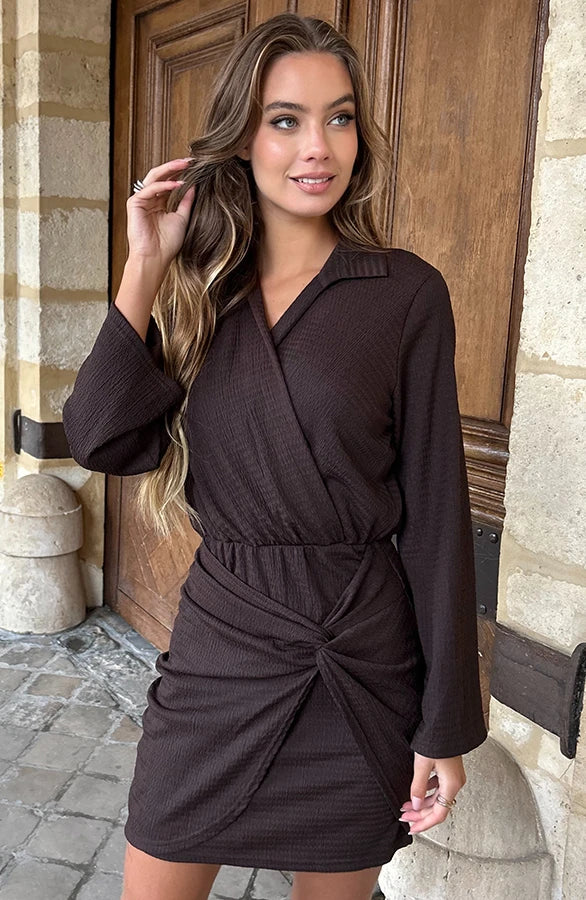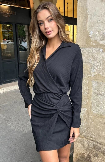 Realizzato in un tessuto morbido e flessibile, questo abito offre una vestibilità impeccabile e una libertà di movimento totale. Il taglio incrociato sul davanti e il nodo laterale aggiungono un dettaglio distintivo che valorizza il punto vita, mentre la chiusura elastica garantisce comfort per tutto il giorno. Facile da indossare e da abbinare, è il capo ideale per chi vuole coniugare stile e praticità in un solo gesto.